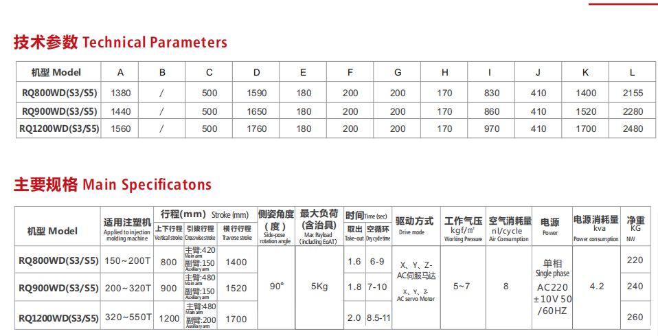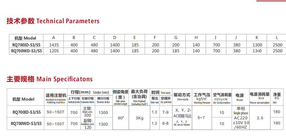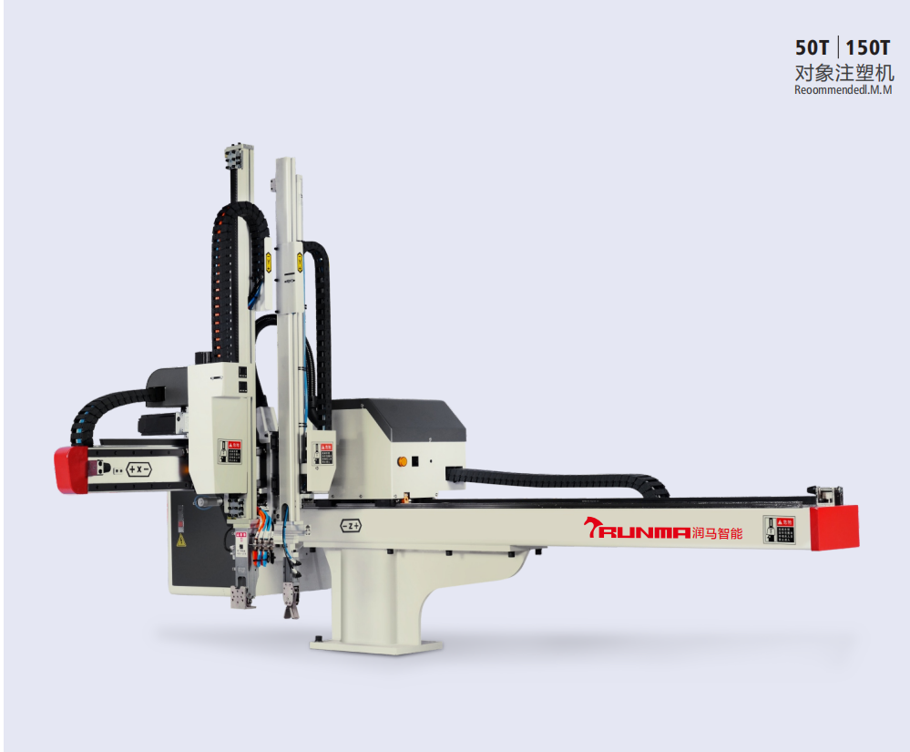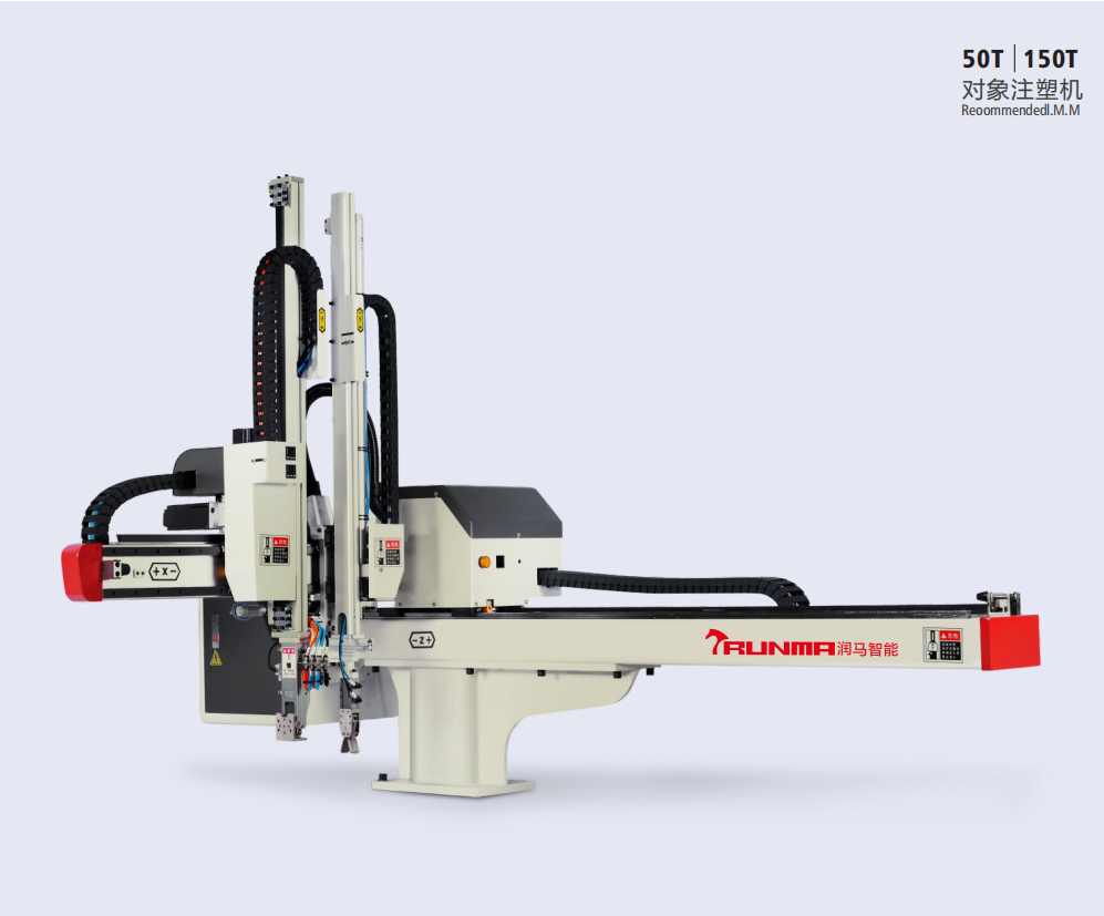 適用于50T--150T注塑機(jī),手臂為單截式,三軸機(jī)型主臂引拔、上采用AC伺服驅(qū)動,副臂引拔、上下氣缸驅(qū)動;五軸機(jī)型副臂引拔、上下均采用AC伺服驅(qū)動。