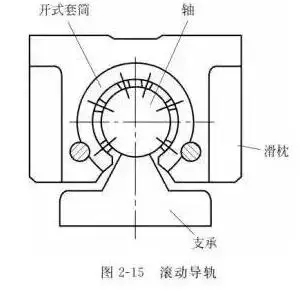 目前第五種滾動導(dǎo)軌在工業(yè)機器人中應(yīng)用最為廣泛,如圖2-15所示為包容式滾動導(dǎo)軌的結(jié)構(gòu),用支承座支承,可以方便地與任何平面相連,此時套筒必須是開式的,嵌入在滑枕中,既增強剛度也方便了與其他元件的連接。