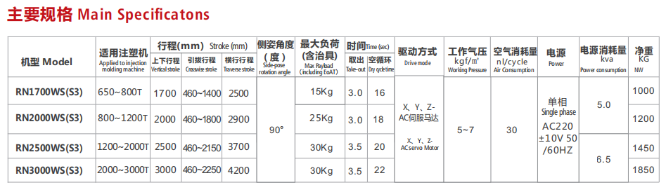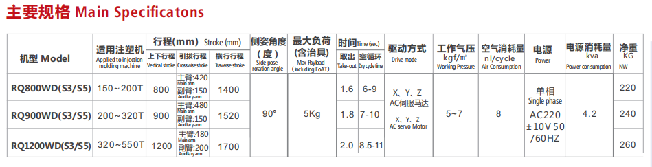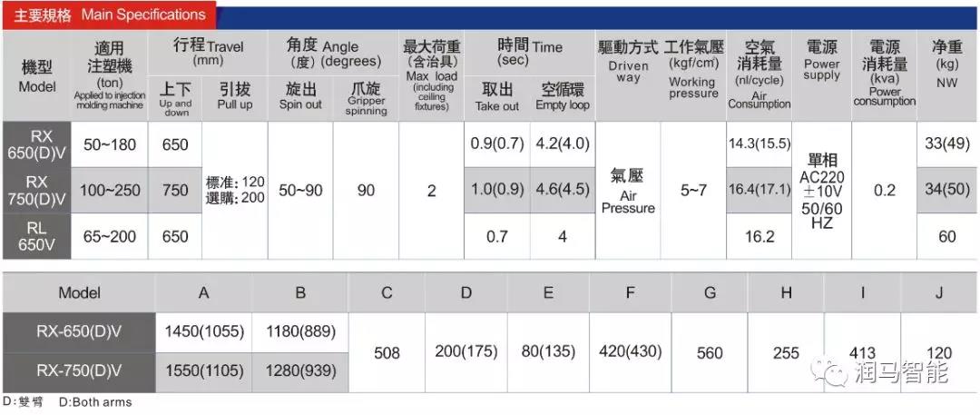 ③多少噸位注塑機:根據(jù)噸位確定機械手手臂上下行程。潤馬目錄冊里面有每種型號機械手適用于多少噸的注塑機。