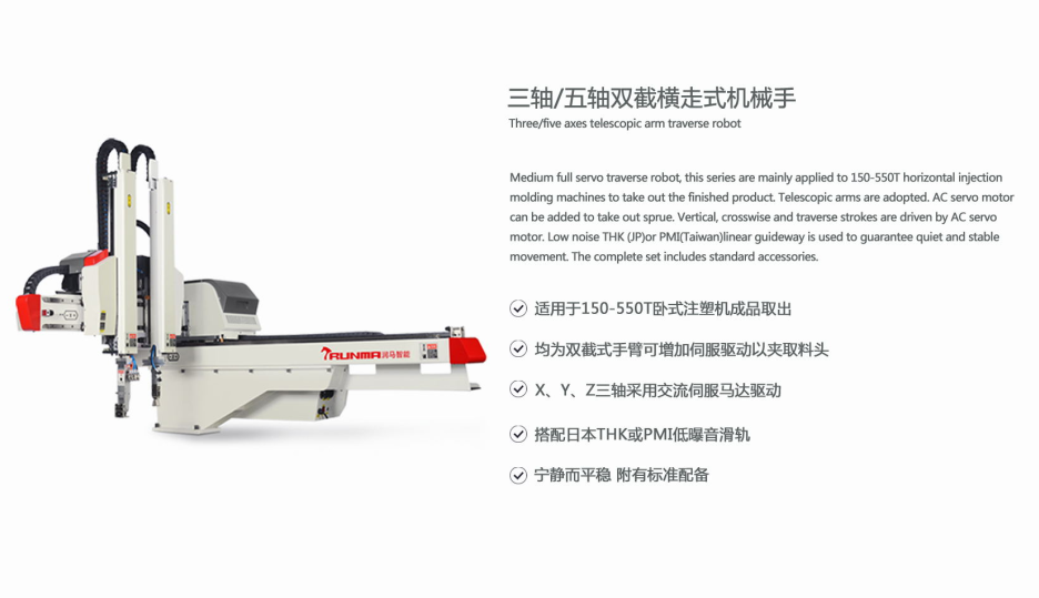 注塑行業(yè)中使用三軸機械手、五軸伺服機械手居多,它們不僅可以模外取產(chǎn)品,模內(nèi)埋入產(chǎn)品(貼標簽、埋入金屬、二次成型等)外,還可以取出后之自動包裝,自動入庫,整廠生產(chǎn)控制系統(tǒng),機械手取出模內(nèi)產(chǎn)品,取代人將原來半自動生產(chǎn)轉(zhuǎn)向全自動化生產(chǎn),成型原料自動供料系統(tǒng),廢料回收系統(tǒng)等。那么日常使用三軸機械手、五軸伺服機械手有哪些注意事項呢?下面大家總結整理一些主要注意事項。