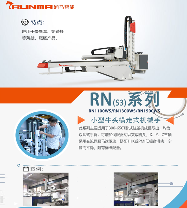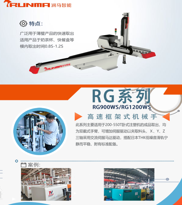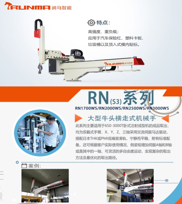 東莞潤馬智能科技有限公司是以一家集設(shè)計、研發(fā)、生產(chǎn)、銷售自動化機械手、工業(yè)機器人等智能設(shè)備的制造企業(yè),公司主營業(yè)務(wù)是從事機械手、塑機輔機、注塑機機械手等自動化設(shè)備的市場推廣及服務(wù),為客戶提供注塑工廠自動化系統(tǒng)集成,是注塑工廠實現(xiàn)減少人工、提高效率、享受自動化的好幫手。