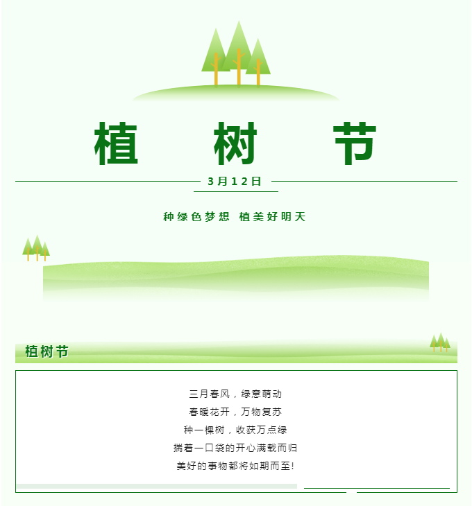 植樹節(jié)是按照法律規(guī)定宣傳保護樹木,并組織動員群眾積極參加以植樹造林為活動內(nèi)容的節(jié)日。按時間長短可分為植樹日、植樹周和植樹月,共稱為國際植樹節(jié)。提倡通過這種活動,激發(fā)人們愛林造林的熱情、意識到環(huán)保的重要性。