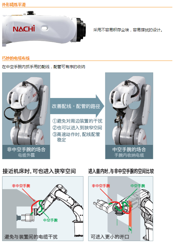 - 通過(guò)中空結(jié)構(gòu)的手腕*智能地對(duì)機(jī)械手電纜進(jìn)行配線。通過(guò)簡(jiǎn)潔的穿插配線防止與周?chē)难b置干擾,設(shè)備的可靠性大幅提高。緊湊,寬大的動(dòng)作范圍。